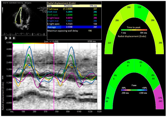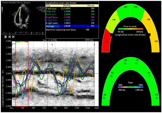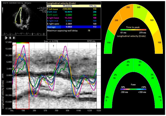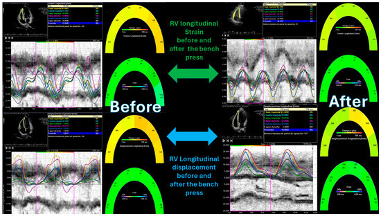 Standard transthoracic echocardiograms were performed using commercially available systems (SC 2000 from Siemens® (Mountain View, USA) in the U.S. and Sequoia 512c (Mountain View, CA, USA)). The examinations were conducted in a decubitus supine position. Apical four-chamber orientation was used to acquire right ventricular functional data. A six-segment model was adopted to assess regional and global right ventricular performance in the longitudinal direction. The region of interest was manually traced along the endomyocardial border in the six segments. The frame rates ranged from 70 to 120 frames per second, utilizing multiple focal points. All images were optimized with adjustments for gain, compression, and dynamic range. Probes 4V1C and 4Z1c were used. Off-line analysis was performed blindly using Syngo software by Siemens® (2013) (Mountain View, USA). Usual echocardiographic parameters recommended by the American Society of Echocardiography were evaluated [31,32]. Right ventricular ejection fraction (RVEF) was calculated using both 2D and 3D images [33]. Right ventricular systolic function was also evaluated using right ventricular isovolumic acceleration (IVA) [31,32,34,35]. The quantification of the right E/E′ ratio and parameters derived from speckle tracking, including strain, strain rate, displacement, as well as longitudinal and radial velocities of the right ventricle, were evaluated. Figure 2, Figure 3, Figure 4 and Figure 5. Global right ventricular strain, including the lateral wall and interventricular septum, was assessed. The right ventricle was divided into six segments in the apical four-chamber view: laterobasal, medial lateral, lateroapical, septoapical, septal medial, and septobasal. The shortening fraction was measured in each segment before and after strength training.