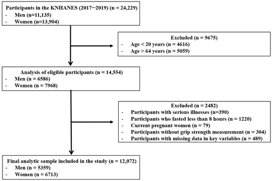The initial survey population consisted of 24,229 individuals who participated in the KNHANES between 2017 and 2019. The following exclusion criteria were applied: participants outside the specified age range of 19–64 years (n = 9675); participants with a self-reported history of cardiovascular disease, stroke, or cancer (n = 390); individuals who did not adhere to an 8-h fasting period (n = 1220); pregnant females (n = 79); participants without GS measurements (n = 304); and those with missing data for variables included in the analysis (n = 489). Consequently, 12,157 individuals were excluded, resulting in a final study population of 12,072 (5359 men and 6713 women) (Figure 1).