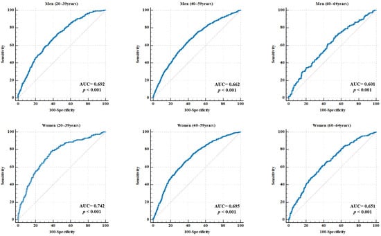 In women, the AUC values were 0.742 (95% CI: 0.724–0.759) for the 20–39 years group, 0.695 (95% CI: 0.680–0.710) for the 40–59 years group, and 0.651 (95% CI: 0.618–0.683) for the 60–64 years group (all p < 0.001). The optimal cutoff values were 0.966, 0.900, and 0.846 kg/BMI, respectively. The sensitivity ranged from 61.54% to 77.85% and the specificity ranged from 61.18% to 64.12%. The 40–59 years age group demonstrated the highest accuracy at 64.37%.