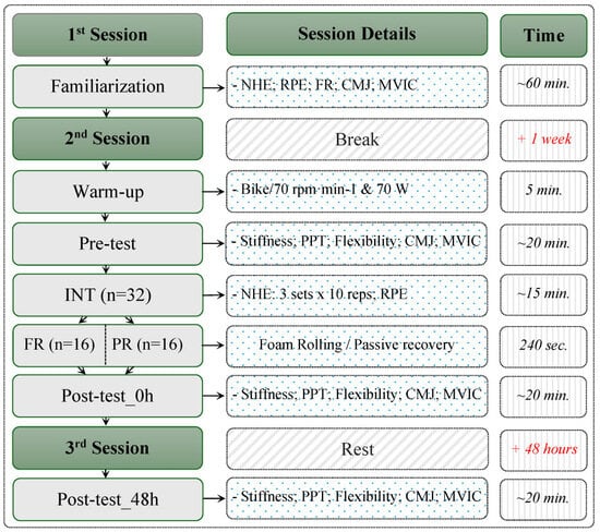 - Pérez-Bellmunt, A.; Casasayas-Cos, O.; Ragazzi, P.; Rodríguez-Sanz, J.; Hidalgo-García, C.; Canet-Vintró, M.; Caballero-Martínez, I.; Pacheco, L.; López-De-Celis, C. Foam Rolling vs. Proprioceptive Neuromuscular Facilitation Stretching in the Hamstring Flexibility of Amateur Athletes: Control Trials. Int. J. Environ. Res. Public Health 2023, 20, 1439. [Google Scholar] [CrossRef]