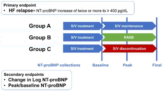 - Januzzi, J.L.; Prescott, M.F.; Butler, J.; Felker, G.M.; Maisel, A.S.; McCague, K.; Camacho, A.; Piña, I.L.; Rocha, R.A.; Shah, A.M.; et al. Association of Change in N-Terminal Pro-B-Type Natriuretic Peptide Following Initiation of Sacubitril-Valsartan Treatment with Cardiac Structure and Function in Patients with Heart Failure with Reduced Ejection Fraction. JAMA 2019, 322, 1085–1095. [Google Scholar] [CrossRef]