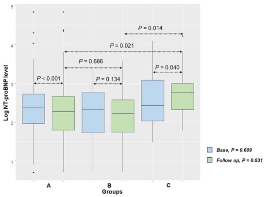 | Follow-up Log NT-proBNP | 2.3 [1.8–2.7] | 2.2 [1.7–2.6] | 2.8 [2.3–3.0] | 0.031 | A = B < C |