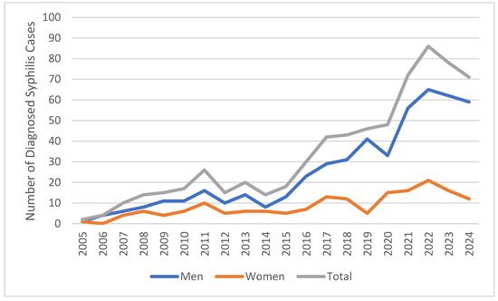 Data from 671 patients diagnosed with syphilis who presented to our hospital between 2005 and 2024 were analyzed. Of these, 501 (74.6%) were male and 170 (25.4%) were female. An overall increase in syphilis cases was observed over the years, with a particularly notable rise since 2016. The proportion of male patients remained higher than that of female patients throughout the study period (