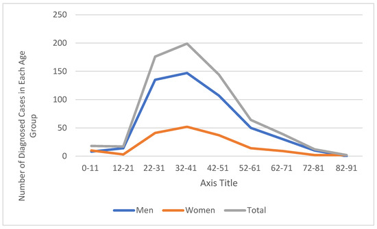 17]. More recent 2022 data indicate that this trend continues, with the male case rate eight times higher than females and the highest number of cases again in the 25–34 age group [