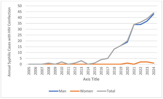 Figure 3). In the early years (2005–2015), coinfection cases were rare or often nonexistent. However, a significant upward trend has been observed since 2016, particularly among male patients. HIV coinfection was observed at a much lower rate in female patients (six cases in total).