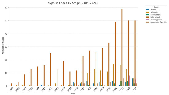 Figure 5 shows a notable increase in late latent syphilis cases starting from 2011, reaching a peak of 50 cases in 2024. This may indicate delayed diagnoses and missed opportunities for early detection. Secondary syphilis cases also rose significantly after 2015, particularly between 2017 and 2022. Primary syphilis remained relatively low but increased in 2023 and 2024, with a maximum of six cases in the final year. Neurosyphilis and congenital syphilis cases became more prominent in recent years. The rise in neurosyphilis (eight cases in 2023) and the reappearance of congenital syphilis in 2022 and 2024 point to gaps in both adult treatment and prenatal screening programs.