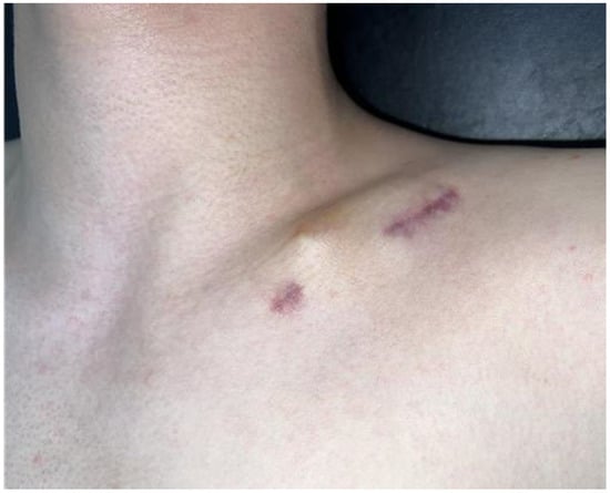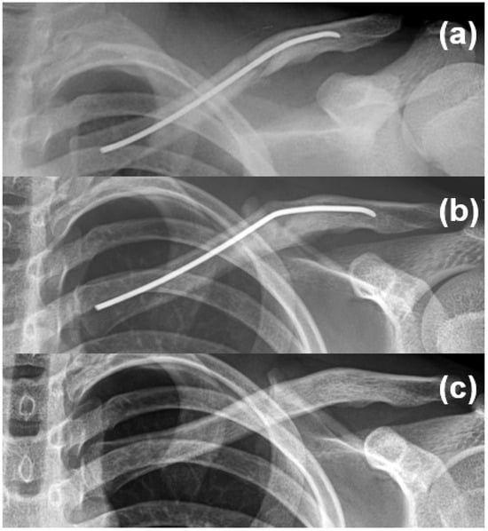 Clavicle fractures are among the most common traumatic injuries in the adolescent population, with diaphyseal lesions accounting for approximately 90% of cases and up to 45% of all shoulder-girdle fractures [,]. The incidence peaks in male adolescents around the age of 14 years, with most injuries resulting from contact or overhead sports, falls, or direct blows to the shoulder []. The thick periosteum and considerable remodeling capacity of the adolescent clavicle support high union rates with simple sling immobilization, making it the recommended first-line treatment [].