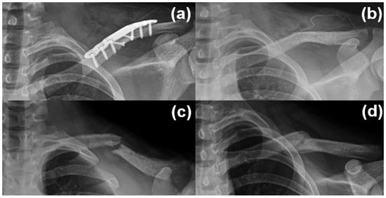 Postoperative management started with arm sling immobilization, and early pendulum exercises were encouraged as tolerated to prevent joint stiffness. At 2 weeks postoperatively, the patients were instructed to remove the sling indoors and begin active shoulder exercises within a pain-free range. Heavy lifting and elevation of the arm above 90° in forward flexion or abduction were restricted, and the use of the sling was maintained outdoors until 4 weeks postoperatively. Radiographic evaluation was conducted preoperatively and at 4 weeks to assess callus formation. Active shoulder motion and return to daily activities were encouraged. Follow-up radiographs were obtained every 2 weeks to monitor healing and guide the return to sports upon confirmed union. Implants were routinely removed approximately 1 year postoperatively after confirmed fracture union, in line with our institutional protocol. This approach reflects the preference of many patients and guardians in South Korea to remove hardware and aims to reduce potential complications during adolescence. All patients agreed to this protocol, resulting in a 100% implant removal rate, unless earlier removal was required due to symptomatic implant irritation.