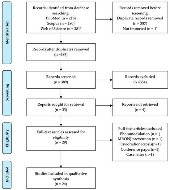 A total of 777 records were identified through database searching. Following import and removal of duplicates, a total of 389 studies underwent title and abstract screening. Of the 33 articles eligible for full-text assessment, four could not be retrieved due to the unavailability of the full text, despite contacting the respective author. From the 29 articles, comprehensive reasons for exclusion upon full-text assessment were: osteoradionecrosis article (n = 1), MRONJ prevention article (n = 1), photomodulation article (n = 1) conference paper (n = 1), case letter (n = 1). Thus, a total of 24 publications were retained for qualitative synthesis [28,29,30,31,32,33,34,35,36,37,38,39,40,41,42,43,44,45,46,47,48,49,50,51]. Cohen’s kappa was employed to evaluate inter-reviewer concordance, resulting in a coefficient of 0.90 [52]. The study selection process is outlined in Figure 1.