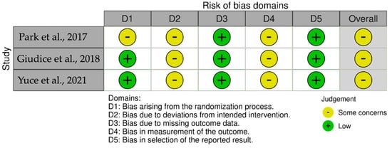 Risk of bias of randomized controlled trials studies according to the RoB-II tool. References: Park et al., 2017 [49], Giudice et al., 2018 [50], Yuce et al., 2021 [51].