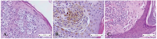 The tissue samples were received by the pathology department from either the General Surgery ward or the Plastic Surgery ward from patients diagnosed with a skin tumoral proliferation who had undergone the surgical excision of the lesions. The tissue samples were fixed in 10% histological formaldehyde and were then processed according to the routine protocol for histopathological processing. Hematoxylin and Eosin staining was performed based on the routine protocol using Epredia Gemini™ Stainer (Epredia, Kalamazoo, MI, USA, 2018). The immunohistochemistry assessment was performed using the Roche Ventana BenchMark (Ventana Medical Systems, Inc., now Roche Tissue Diagnostics, Tucson, AZ, USA, 2021) automated staining system.