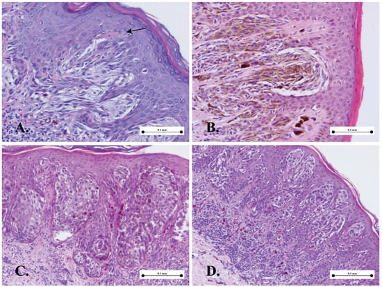 The exact pathogenesis of Spitz tumors remains unclear; however, recent studies have identified a series of gene fusions and mutations that are responsible for their development. Although the Spitz nevus is a benign lesion, its peculiar characteristic lies in its close histopathological resemblance to melanoma rather than to a conventional nevus []. The genomic landscape of Spitz neoplasms includes fusions in genes such as ALK, ROS1, MET, RET, or BRAF and mutations in HRAS genes, which influence both the tumor’s biological behavior and morphological features [,,,]. Given the unique and complex morphology of Spitz lesions, contemporary approaches should focus on combining clinicopathological characteristics with ancillary studies such as immunohistochemistry and molecular testing to enhance diagnostic accuracy. Unfortunately, in our study, molecular testing was not available.