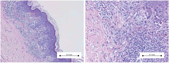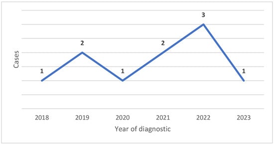 Our study analyzed the macroscopic features and histological characteristics of nine Spitz nevi and one atypical Spitz tumor over a 6-year period (Figure 5). Consistent with findings from other studies, a significant decrease in skin neoplasms was observed in our research during the COVID-19 pandemic []. Based on all Spitz melanocytic lesions diagnosed in the pathology department, it can be seen from Table 2 that most of the patients were under 20 years old, with the oldest patient being 40 years old. In our study, the mean age at diagnosis was 20.2 years, which is in line with data in the current literature [,]. Spitz lesions usually appear in young people but may appear at any age. Reports suggest that Spitz nevi are slightly more common in female individuals [,,]. Similarly, our study demonstrated a predominance of female gender among those with Spitz nevi.