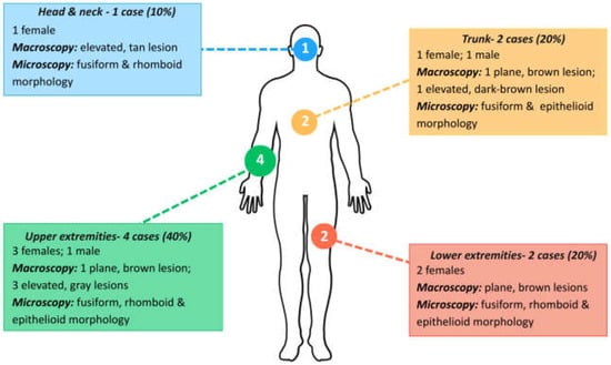 In terms of the anatomic distribution of the lesions, the topographic area varied. Most of the cases were located on the upper extremity (n = 4; 40%), followed by the lower extremity (n = 2; 20%) and the trunk (n = 2; 20%). In a study conducted by Uzuncakmak T., it was reported that the anatomical distribution of Spitz nevi varied with age, with a higher prevalence on the upper extremities in pediatric patients, while lower extremities were a more common site in adults []. Regarding gross examination, lesions exhibited varying clinical appearance. Half of the lesions were elevated from the skin, whereas the other half were plane lesions. Most Spitz nevi were less than 1.5 cm in diameter and varied greatly in color, from tan to dark brown. Likewise, in a study by Herzum et al. conducted on 255 pediatric patients, small, pigmented, flat lesions were found to be associated with benign morphological features [].