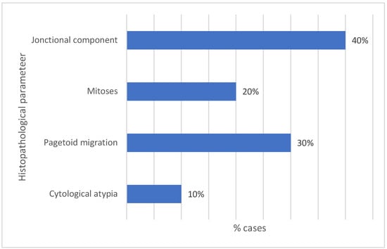 The data were collected from the histopathological reports prepared after microscopic examination. The epidemiological data were represented by the year of diagnosis, age of the patient, and gender. The macroscopic data were represented by the localization of the lesion, macroscopic appearance, macroscopic dimension (mm)/diameter or circumference (mm3/mm), macroscopic shape, and macroscopic color. The microscopic parameters analyzed included the cell shape, the presence or absence of cytological atypia, pagetoid migration, the presence or absence of mitoses, the presence or absence of junctional components, and the immunohistochemistry performed. Macroscopic and microscopic lesions were also assessed, together with the final histopathological diagnostics. The data were represented and analyzed using Microsoft Office suite. Statistical analysis was performed using GraphPad Prism 10.5.0 (GraphPad Software, Inc., San Diego, CA, USA). The Pearson correlation coefficient was used for the evaluation of the relationships between the studied variables in the case of numeric or binary variables. Every correlation was represented by the r coefficient together with the p value (two-tailed) for statistical significance. Due to the small number of cases included in the study, the results should be interpreted with caution. The small cohort represents a limitation in the statistical value of extrapolating the results to a larger scale. Moreover, type I errors (a false-positive effect) or type II errors (the impossibility of the detection of a real effect) can appear. This study is predominantly descriptive.