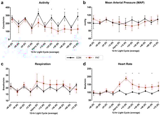 Diurnal cycling of activity and physiological vitals: telemetric analysis of (a) activity, (b) MAP, (c) respiration, and (d) HR. To account for the diurnal cycle, the values were averaged throughout the 12-h period (D = day and N = night). Control (CON) shown in black with circles and Penetrating Abdominal Trauma (PAT) shown in red with squares. Data are presented as mean ± SD, * p < 0.05. Control group: n = 4. PAT group: n = 8.