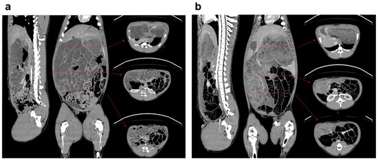 Comparison of computed tomography (CT) of abdomen after 72 h: sagittal, coronal, and axial planes of (a) Penetrating Abdominal Trauma (PAT) group vs. (b) Control group. Representation of free fluid and air in the peritoneal cavity with peritoneal thickening in animals of the PAT group. Red arrows indicate the location of the axial plane.