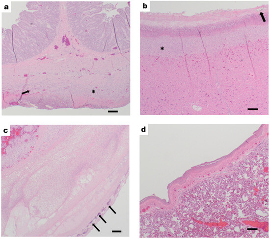 Histological examination, representative H&E staining: (a) jejunum, (b) liver, (c) spleen, and (d) lung from the PAT group taken at 40X magnification. (a) Jejunum: subacute, focally extensive, moderate serositis with necrosis, fibrin, neutrophils, fibrinonecrotic debris, and embedded plant material (arrow). (b) Liver: subacute, diffuse, marked serositis and hepatitis with necrosis, fibrin, neutrophils, fibrinonecrotic debris, and embedded plant material (arrow). (c) Spleen: acute, diffuse, severe serositis with necrosis, fibrin, neutrophils, fibrinonecrotic debris, severe necrosis, and edema. Colonies of bacteria are indicated (arrows). (d) Lung: acute, diffuse, moderate serositis with necrosis, fibrin, neutrophils, and fibrinonecrotic debris. (*) indicates early granulation tissue and mononuclear cell infiltration. Scale bar = 500 µm.