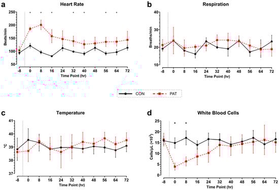 SIRS criteria in Penetrating Abdominal Trauma group vs. Control group: (a) heart rate (HR), (b) respiration, (c) temperature, and (d) white blood cell count (WBC, from whole blood). Telemetry data averages for every 8-h timepoint, corresponding with each blood draw (a–c). The average WBC count before surgery and every 8 hr timepoint post-surgery (d). Dotted line represents approximate time of injury. Control (CON) shown in black with circles and Penetrating Abdominal Trauma (PAT) shown in red with squares. Data are presented as mean ± SD, * p < 0.05. Control group: n = 4. PAT group: n = 8.