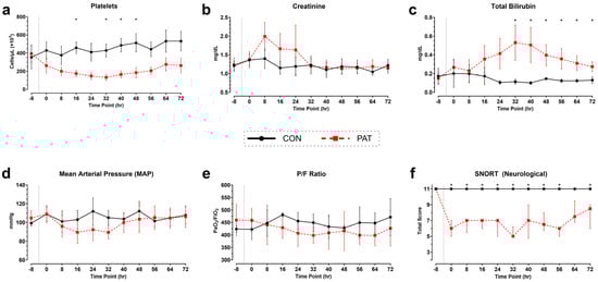 SOFA criteria in Penetrating Abdominal Trauma group vs. Control group: (a) Platelet count, (b) creatinine concentration, and (c) total bilirubin from whole blood. The values are the averages at each individual blood draw before and after injury. (d) Mean arterial pressure (MAP) recorded through telemetric implant. (e) P/F-ratio (ratio between arterial O2 partial pressure (PaO2) and fraction of inspired (Fi) O2. Data are presented as mean ± SD. (f) Neurological assessment, SNORT (swine neurological observed response test), of animals before and after surgery. Data are presented as median [IQR]. Dotted line represents the approximate time of injury. Control (CON) shown in black with circles and Penetrating Abdominal Trauma (PAT) shown in red with squares. * p < 0.05. Control group: n = 4. PAT group: n = 8.
