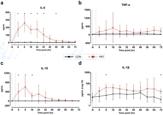 Cytokine results baseline to 72 h: (a) IL-6, (b) TNF-α, (c) IL-10, and (d) IL-1β. Dotted lines represent baseline levels at −8 and approximate time of injury. Control (CON) shown in black with circles and Penetrating Abdominal Trauma (PAT) shown in red with squares. Data are presented as mean ± SD, * p < 0.05. Control group: n = 4. PAT group: n = 8.