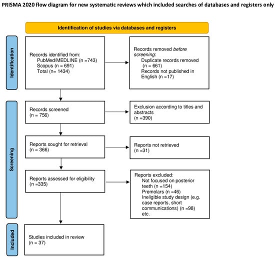 A total of 1434 articles were identified through comprehensive searches conducted in the MEDLINE database via PubMed and Scopus. After record removal due to duplicates, language restrictions, lack of relevance (e.g., anterior teeth), ineligible study types (e.g., case reports, letters, short communications, conference abstracts), insufficient focus on posterior ETT, lack of direct evaluation of endocrowns to post-and-core restorations, or failure to meet design criteria, a total of 37 articles were included in this scoping review. The selection process is outlined in Figure 2 [].