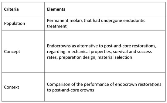 Factors affecting the survival and success rates of endocrowns include, among others, the material type used and the preparation design, with emphasis on the finish line, occlusal reduction, and extension into the pulp chamber. The extent to which each factor influences the performance of endocrowns needs further investigation. While systematic reviews have focused on specific aspects such as materials or survival rates [,,,,], the available literature on endocrown restorations remains diverse in scope, methodology, and outcomes. Given this heterogeneity and the emerging nature of adhesive and restorative techniques, a scoping review is warranted to provide a broad mapping of current evidence, clarify key concepts, and identify gaps for future research. The objective of this scoping review is to investigate and summarize the most recent data on the application of endocrowns for restoring severely damaged posterior ETT, focusing on comparing the clinical performance of endocrowns to that of post-and-core restorations, identifying the most appropriate materials and preparation techniques, and highlighting areas where additional research and standardization are needed.