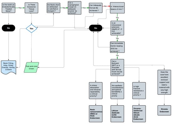 To support clinical decision-making in the restoration of endodontically treated posterior teeth, a decision tree was developed based on the findings of this scoping review (Figure 3). This visual guide summarizes key criteria for selecting endocrown restorations, including remaining tooth structure, pulp chamber depth, presence of ferrule, available interocclusal space, material choice (LDS, ZLS, RNC), and adhesive technique. The aim is to assist clinicians in making evidence-based, case-specific restorative decisions that enhance the predictability and long-term success of treatment outcomes.