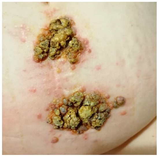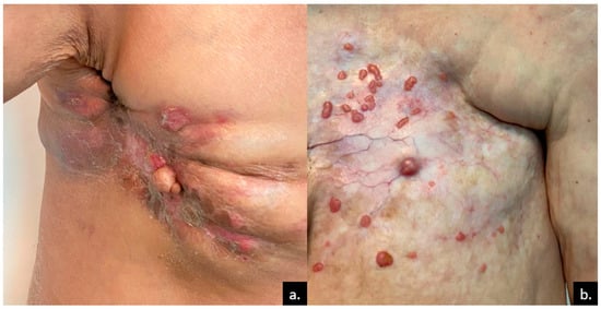 - De Giorgi, V.; Grazzini, M.; Alfaioli, B.; Savarese, I.; Corciova, S.A.; Guerriero, G.; Lotti, T. Cutaneous manifestations of breast carcinoma. Dermatol. Ther. 2010, 23, 581–589. [Google Scholar] [CrossRef]