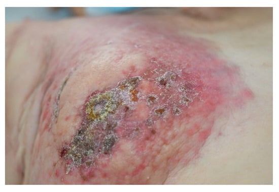 - Nakamura, N.; Kawamori, J.; Takahashi, O.; Shikama, N.; Sekiguchi, K.; Takahashi, T.; Kato, S.; Ogita, M.; Motegi, A.; Akimoto, T. Palliative radiotherapy for breast cancer patients with skin invasion: A multi-institutional prospective observational study. Jpn. J. Clin. Oncol. 2018, 48, 555–558. [Google Scholar] [CrossRef] [PubMed]