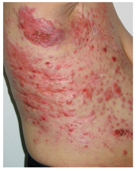 - Virmani, N.C.; Sharma, Y.K.; Panicker, N.K.; Dash, K.N.; Patvekar, M.A.; Deo, K.S. Zosteriform skin metastases: Clue to an undiagnosed breast cancer. Indian. J. Dermatol. 2011, 56, 726–727. [Google Scholar] [CrossRef]