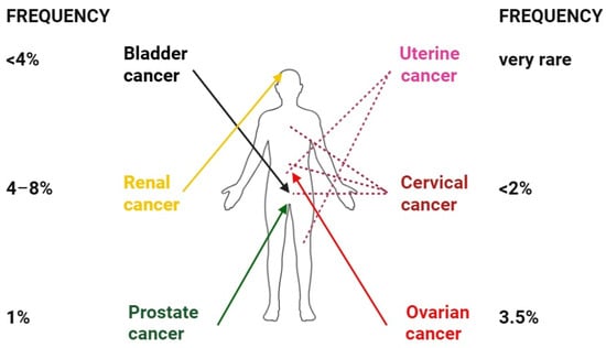 | Bladder [67,68,69,70,71,75,76] | Not specific | Not specific | CK7, CK20 | <12 |