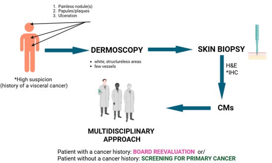 - Gor, D.; Ghimire, B.; Abbas, O.; Diab, M. Cutaneous metastases without a known primary: A clinical conundrum. Cureus 2025, 17, e83591. [Google Scholar] [CrossRef]