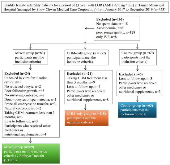 A retrospective cohort study was carried out from the outpatient records of Tainan Municipal Hospital (managed by Show Chwan Medical Care Corporation) in Taiwan. The patient data from January 2017 to December 2019 were retrieved. We enrolled patients diagnosed with female infertility by using the ICD-9-CM (the International Classification of Diseases, 9th Revision, Clinical Modification) code 6289. The collected data contained age, duration of infertility, body mass index (BMI), serum AMH levels, smoking, alcohol use, primary or secondary infertility, and causes of infertility. The eligibility criteria for inclusion were: (1) duration of infertility ≥ 1 year; aged 25–45 years; (2) the level of serum AMH < 2.0 ng/mL before treatment; (3) normal tubal patency; (4) partners with normal sperm quality. Exclusion criteria were: (1) loss to follow-up; (2) intrauterine insemination; (3) chromosomal abnormality; (4) uterine malformations; (5) contraceptive pill use or adjuvant supplementation for at least four weeks prior to the study; (6) cancer treatments; and (7) received other medicines, certain micronutrients, and adjuvant supplementation, such as dehydroepiandrosterone (DHEA), coenzyme Q10 (CoQ10) vitamin E, and growth hormone, during the CHM treatment. The following patients were excluded from this study: donor oocytes, sperm, pre-implantation genetic diagnosis (PGD), and pre-implantation genetic diagnosis (PGS).