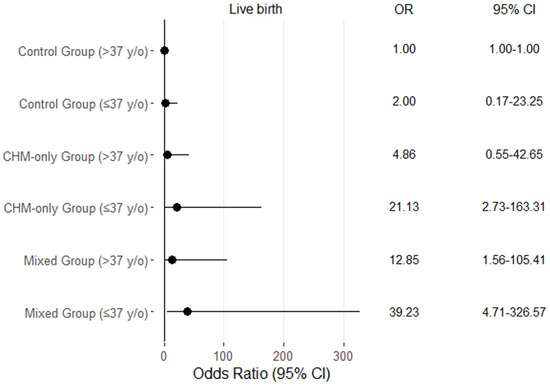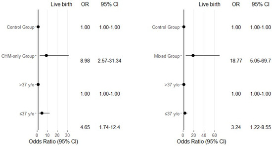 Univariate logistic regression analyses were conducted to assess the association of treatment type, age, body mass index (BMI), anti-Müllerian hormone (AMH) levels, and infertility type with clinical pregnancy and live birth outcomes. Compared to the control group, both the CHM-only group and the mixed treatment group showed significantly higher odds of achieving clinical pregnancy and live birth. Specifically, the CHM-only group had significantly increased odds of clinical pregnancy (OR = 4.93, 95% CI: 2.06–11.76, p < 0.001, Table 2) and live birth (OR = 9.13, 95% CI: 2.68–31.03, p < 0.001, Table 2). The mixed treatment group demonstrated even higher odds for clinical pregnancy (OR = 8.47, 95% CI: 3.39–21.14, p < 0.001, Table 2) and live birth (OR = 14.14, 95% CI: 4.04–49.53, p < 0.001, Table 2). Younger age (≤37 years) was associated with a significantly greater likelihood of live birth (OR = 2.87, 95% CI: 1.57–5.25, p = 0.001, Table 2), although the increase in clinical pregnancy rate did not reach statistical significance (OR = 1.53, 95% CI: 0.90–2.59, p = 0.114, Table 2). BMI and AMH levels were not significantly associated with either clinical pregnancy or live birth outcomes. Likewise, secondary infertility was not significantly associated with higher clinical pregnancy (OR = 1.73, 95% CI: 0.90–3.31, p = 0.098, Table 2) or live birth rates (OR = 1.19, 95% CI: 0.59–2.40, p = 0.621, Table 2). We explored the interaction effect between treatment groups and age by including an interaction term in a logistic regression model (treatment × age group). The results were visualized using a stratified forest plot, as shown in the revised figure. The stratified odds ratios suggest potential effect modification, particularly in the CHM-only and Mixed groups, where younger participants (≤37 y/o) had substantially higher odds of live birth compared to older participants (Table 2 and Figure 2).