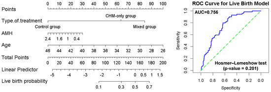 The nomogram integrates three significant predictors—type of treatment, anti-Müllerian hormone (AMH) level, and age—to estimate the individual probability of achieving a live birth (Figure 4). Each predictor corresponds to a specific number of points on the topmost “Points” scale. For the type of treatment, patients receiving mixed treatment receive the highest point contribution, followed by those in the CHM-only group, with the control group receiving zero points, reflecting its reference status in the model (Figure 4). AMH levels are inversely associated with points: lower AMH (closer to 0 ng/mL) corresponds to higher points and thus lower predicted live birth probability (Figure 4). Younger age also contributes more points, indicating that younger patients have higher predicted probabilities of live birth (Figure 4). By summing the individual point values for all predictors, a total point score is obtained. This total is then mapped to a linear predictor scale, which is further translated into the predicted live birth probability at the bottom of the nomogram, ranging approximately from 0.1 to 0.7 (Figure 4). The AUC of the model is 0.756 and the Hosmer–Lemeshow test has a p-value = 0.201, indicating good discriminatory power. This means the model has a 75.6% chance of correctly distinguishing between individuals who will and will not achieve a live birth. The upward bend of the ROC curve toward the top-left corner reflects favorable sensitivity and specificity trade-offs.