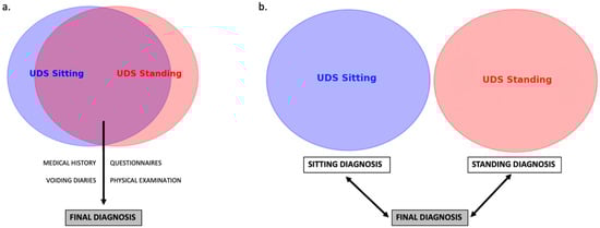 To assess concordance, a second urologist, blinded to clinical data and final diagnoses, retrospectively reviewed the original UDS traces. Seated and standing studies were assessed separately, without simultaneous comparison of traces from the same patient during the evaluation. Concordance between these individual UDS-based diagnoses and the original comprehensive diagnoses was then analyzed. A schematic overview is shown in Figure 1.