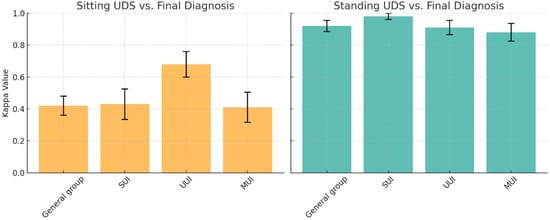 This analysis demonstrated a moderate agreement (κ = 0.42, SE 0.36–0.48) for sitting UDSs but an almost perfect agreement (κ = 0.92, SE 0.89–0.96) for standing UDSs compared to the final diagnosis. Similar patterns were observed in subgroup analyses stratified by incontinence type (see Figure 2), with the highest kappa value being 0.98 (SE 0.96–1.00) in the standing group with the diagnosis of SUI.