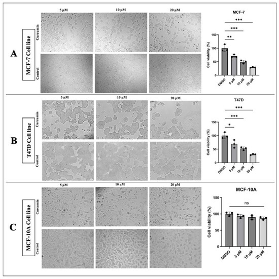Cell viability and cell proliferation state. Curcumin treatment reduced cell viability and proliferation in a dose-dependent manner in (A) the MCF-7 cell line, and (B) the T47D cell line. (C) Curcumin caused a non-significant change in the viability and proliferation of MCF-10A cells (* p < 0.05, ** p < 0.01, *** p < 0.001). Error bars represent the standard deviations.