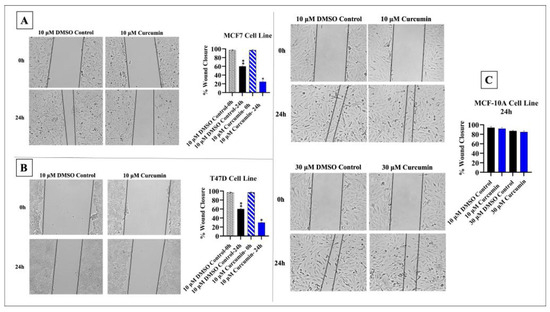 The half-maximal inhibitory concentration (IC50) value of curcumin was 10 μM, and therefore, this concentration was used in the following experiments. Cells’ treatment with 10 μM curcumin significantly inhibited the migration of MCF-7 and T47D cells compared to that of the controls (p < 0.05). In MCF-10A cells, 10 μM and 30 μM curcumin treatment had a quite limited effect on cell migration compared to the effect seen in cancer cells (Figure 2).