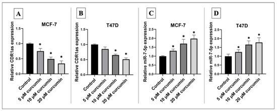 Relative expression level of hsa_circ_0001946 and miR-7-5p after curcumin treatment. (A) Curcumin treatment significantly downregulated hsa_circ_0001946 expression in MCF-7 cells. (B) A similar downregulation of hsa_circ_0001946/CDR1as was observed in T47D cells following curcumin treatment. (C) MiR-7-5p expression was significantly upregulated in MCF-7 cells after curcumin treatment. (D) Curcumin induced a significant upregulation of miR-7-5p in T47D cells (* p < 0.05). Error bars represent the standard deviations.