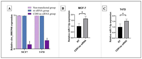 (A) Validation of CDR1as siRNA transfection. (B) Relative expression levels of miR-7-5p after CDR1as siRNA and NT siRNA control transfection in MCF-7 cell line. (C) MiR-7-5p expression after CDR1as siRNA and NT siRNA control transfection in T47D cell line (* p < 0.05, ** p < 0.01, *** p < 0.001) (NT: non-target siRNA negative control). Error bars represent the standard deviations.