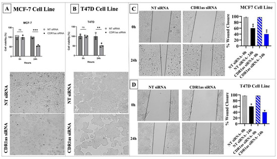 Cell viability, proliferation, and migration were significantly reduced in MCF-7 and T47D cells following transfection with CDR1as siRNA compared to NT siRNA (p < 0.05) (Figure 5).