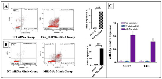Effects of circ_0001946 knockdown and miR-7-5p overexpression on apoptosis and miR-7-5p expression. (A) Cell apoptosis rates following circ_0001946 knockdown in MCF-7 cells. (B) Cell apoptosis rates following miR-7-5p overexpression in MCF-7 cells. (C) Validation of miR-7-5p mimic transfection in MCF-7 and T47D cell lines (*** p < 0.001). Error bars represent the standard deviations.