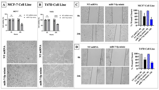 Additionally, cell viability, proliferation, and migration significantly decreased in MCF-7 and T47D cells transfected with the miR-7-5p mimic compared to the control (p < 0.05) (Figure 7).