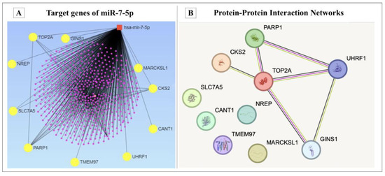 MiRNet analysis identified 578 potential target genes for miR-7-5p, with 1023 predicted interactions among them. According to the analysis of TCGA BC data, 545 genes were found to be upregulated in BC samples under the defined selection criteria. In total, 10 overlapped genes between TCGA data and miRNet data were identified for this study. The selected genes were CKS2, TOP2A, GINS1, NREP, SLC7A5, PARP1, TMEM97, UHRF1, CANT1 and MARCKSL1, as presented in Figure 8. Using the STRING database, a stronger relationship was observed in the potential PPI analysis between the CKS2, PARP1, TOP2A, UHRF1 and GINS1 genes, and the PPI enrichment p-value was below 0.000567 (Figure 8).