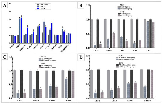 To identify potential curcumin-regulated targets, gene expression profiles of BC cell lines were first compared with those of the MCF-10A cell line. Five genes (CKS2, TOP2A, PARP1, UHRF1, and GINS1) were significantly upregulated in both the MCF-7 and T47D cell lines. Among these, treatment with curcumin led to a significant downregulation of CKS2, TOP2A, PARP1, and UHRF1 in both BC cell lines. Transfection experiments with CDR1as siRNA or the miR-7-5p mimic further confirmed that the expression of all four genes was significantly reduced in MCF-7 cells, and that the expressions of three of these genes (CKS2, TOP2A, and PARP1) were similarly downregulated in T47D cells (Figure 9).