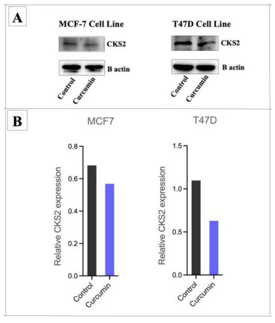Western blot analysis showing reduced CKS2 protein expression in MCF-7 and T47D cells after curcumin treatment. (A) Representative images of Western blot analysis of CKS2, and with B actin as the loading control in MCF-7 and T47D cells. (B) Curcumin treatment significantly decreased CKS2 protein expression in both the MCF-7 and T47D cell lines.