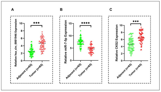 Relative expression levels of hsa_circ_0001946, miR-7-5p and CKS2 in BC patient tumor tissue samples compared to adjacent normal tissue samples. (A) The expression level of hsa_circ_0001946 was significantly upregulated in tumor tissues. (B) MiR-7-5p expression was significantly decreased in breast cancer samples. (C) CKS2 expression was consistently upregulated in BC tissues (*** p < 0.001, **** p < 0.0001). Error bars represent the standard deviations.