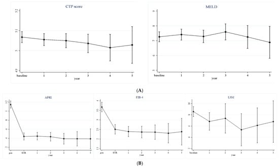 3.2. Longitudinal Changes in Liver Function after Antiviral Treatment